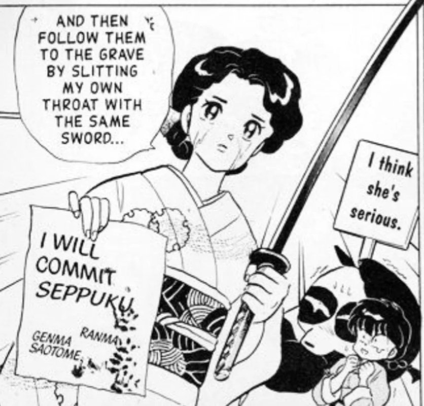 ['Nodoka' speaks in that disapproving, disappointing tone only a mother could give, her eyes never losing their soft look, yet carry a sharp edge that betrays anything nurturing. Ranma refuses to look her in the eye, frozen on the spot and shrinking more when the katana's blade becomes more visible.]